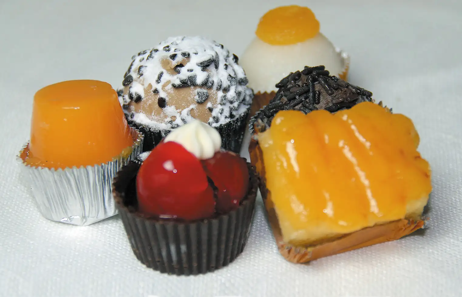 Nata, trufa o de nata i trufa, Sacher, Xocolata, Sara d’ametlla, Massini, Sant Marc, Full amb fruita natural, Mantega, Crema cremada, Melmelada amb fruita confitada, Red velvet, Carrot cake o de pastanaga, Cheese cake o de formatge. Merenga de llimona.