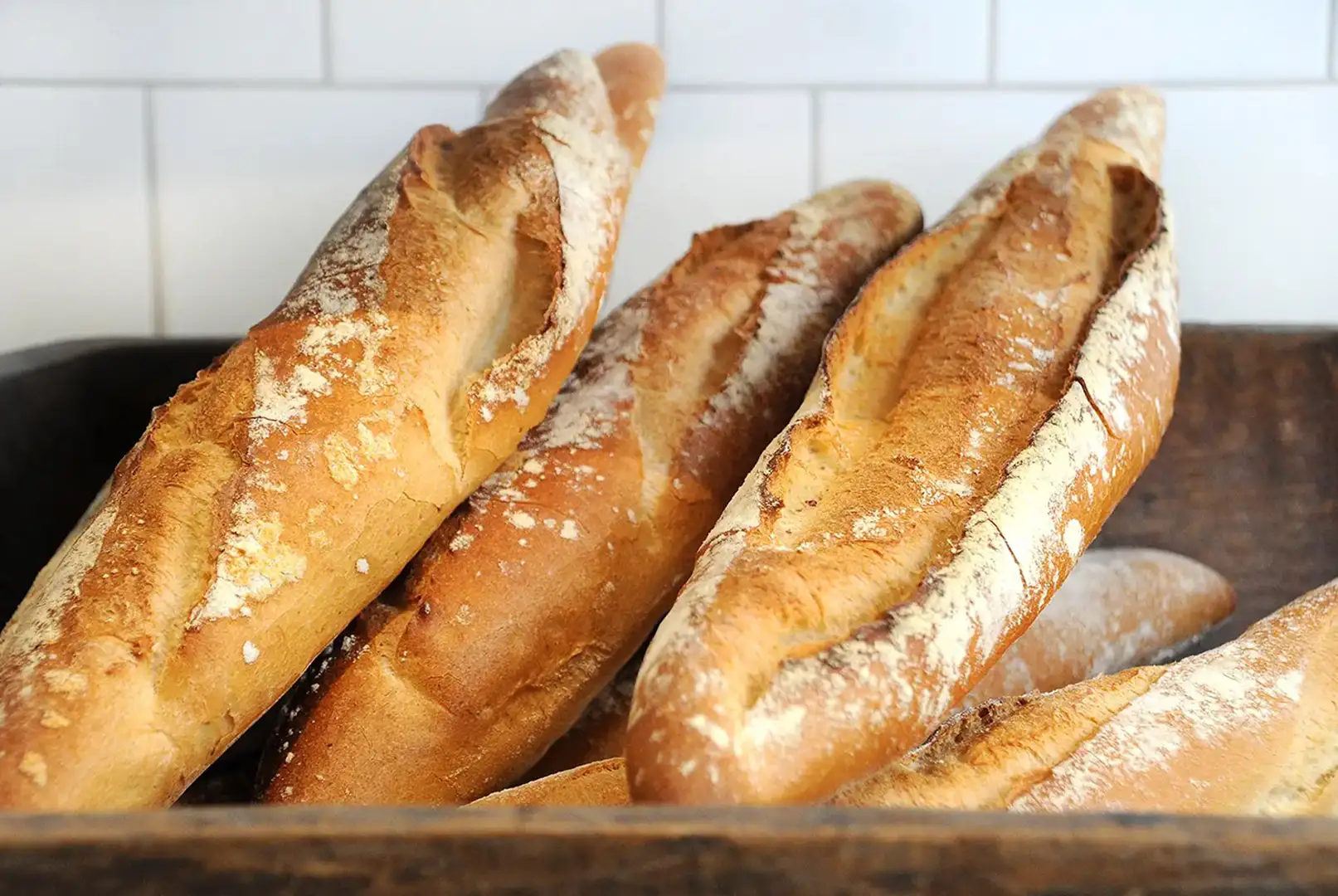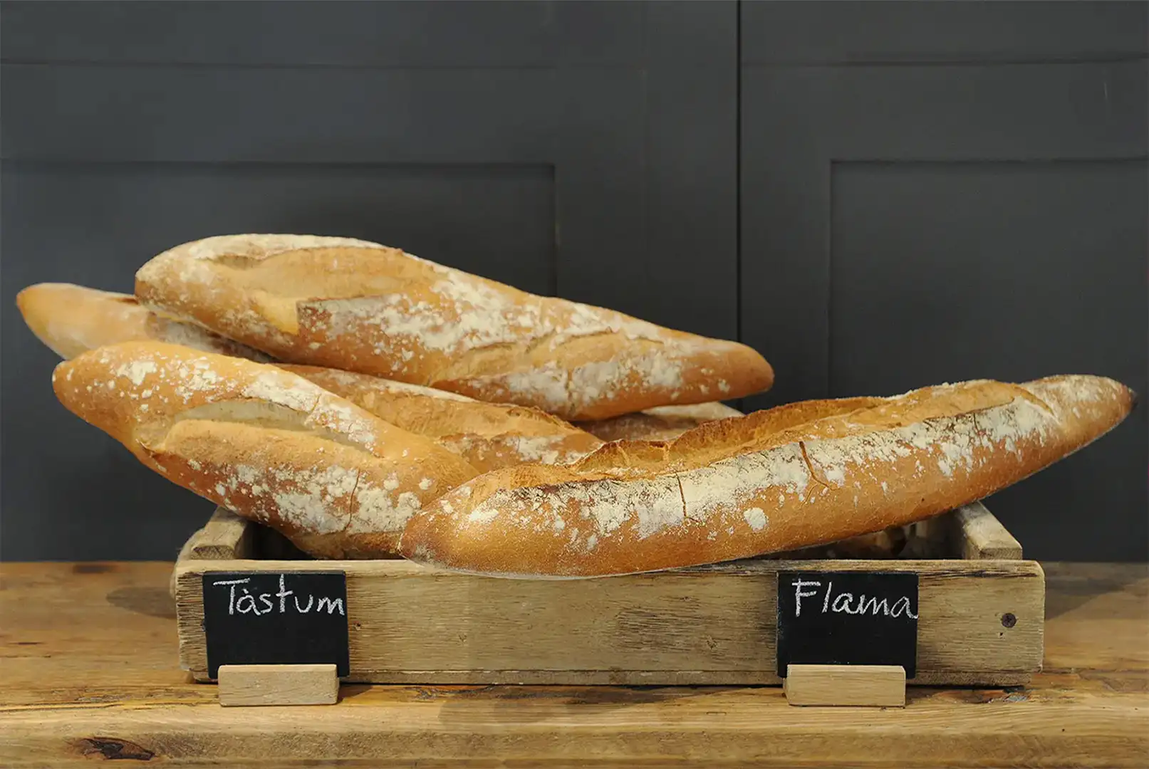 És la barra de la casa, de petit i gran format, més aviat ampla del mig i punxeguda dels extrems. Elaborada amb farina de blat natural i farina especial crema, de fermentació lenta i cocció en forn de sola. Pa de crosta daurada amb una molla airejada i cremosa. Una delícia per cada dia a la taula.