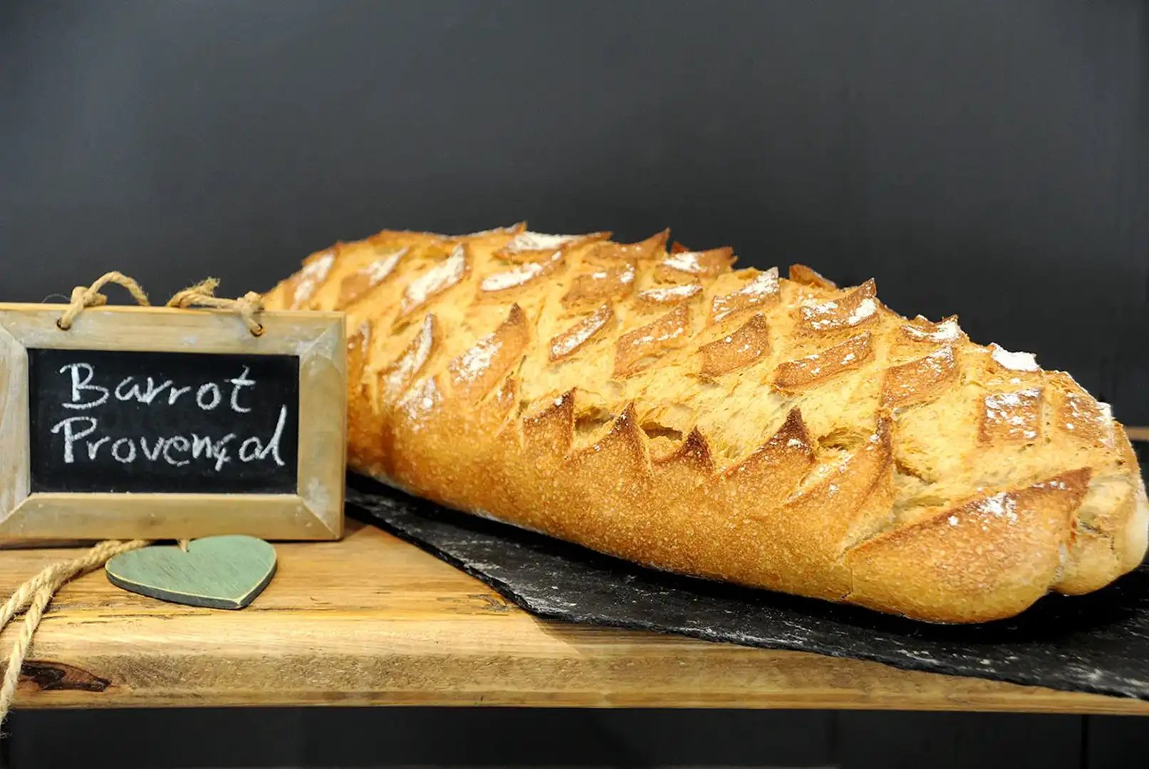 Elaborat a partir d’una combinació de farines ecològiques moltes a la pedra, tant de blat com integral, que aporten molt de sabor i aroma al pa, i una llarga conservació. El barrot provençal és una peça de 2kg en massa que es talla i es ven a pes, de molla fosca, humida i esponjosa, i crosta fina i cruixent.